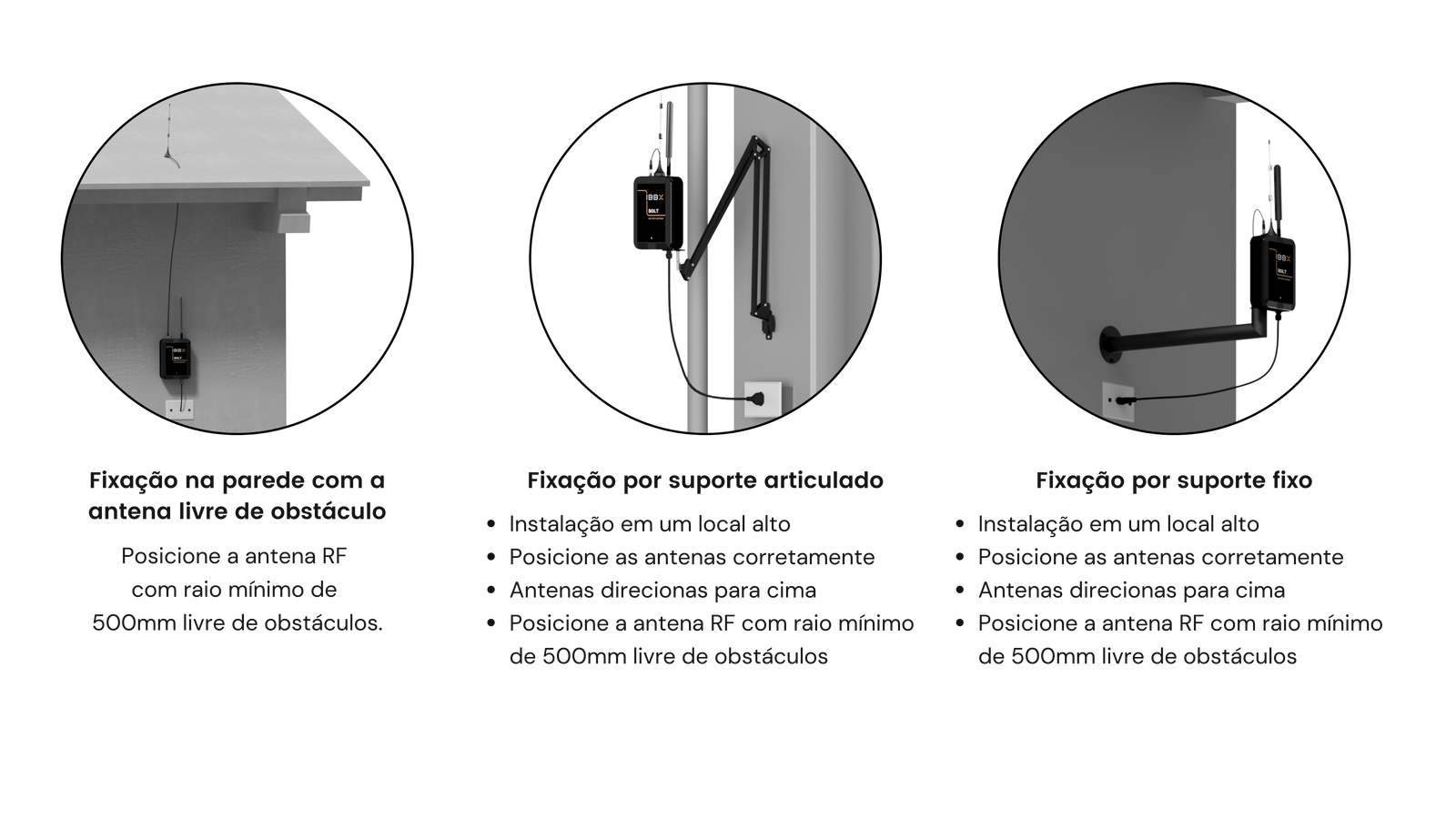 The IBBX BOLT must be fixed to a bracket, which can be fixed or articulated. The choice of support model to be used should be made after defining the device's installation site, which must be prepared in advance.