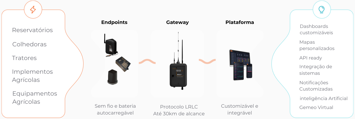 Possibilitamos a leitura e o monitoramento de qualquer dado em campo, a quilômetros de distância, incluindo umidade, acidez, temperatura, status de maquinários, produtividade, capacidade disponível de silos, entre outros.